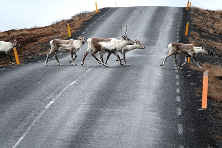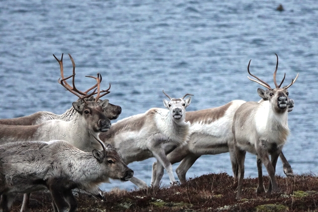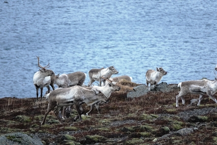 Am nächsten Morgen dann leichter Regen. Wie schade! Das Wetter heute ist ein Mix aus Regen/Bewölkung/mal etwas Sonne, leider immer verbunden mit heftigem Wind! Immer wieder kreuzen Rentiere vor uns die Straße. Teilweise sehen wir große Herden entlang des Weges.