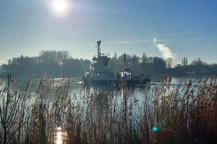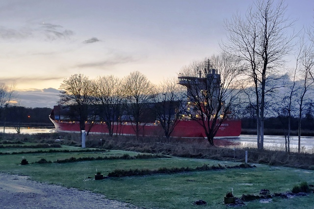 Wir beschließen, nicht weiter nach Norden zu fahren, sondern noch einen Abstecher zum Nord-Ostsee-Kanal zu machen. Hier kennen wir einen Wohnmobil-Stellplatz, von dem aus man Schiffe beobachten kann. Eigentlich hat der Platz im Winter geschlossen, aber über die Feiertage hat man ihn geöffnet. Einige wenige Wohnmobile sind hier, die meisten sind wohl schon wieder heimwärts unterwegs. Immer wieder regnet oder graupelt es. Eine kurze Pause nutzen wir für einen Spaziergang am Kanal. Danach halten wir uns lieber im MAN auf und schauen von dort aus den Schiffen zu.