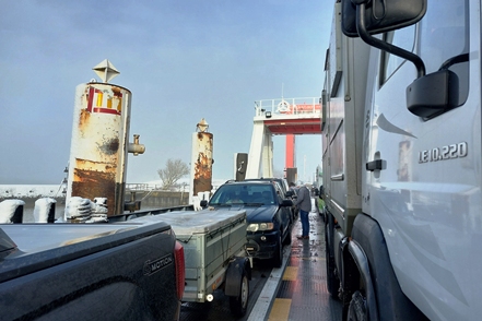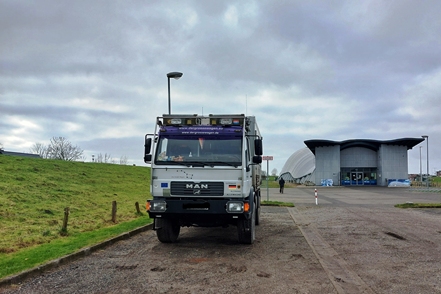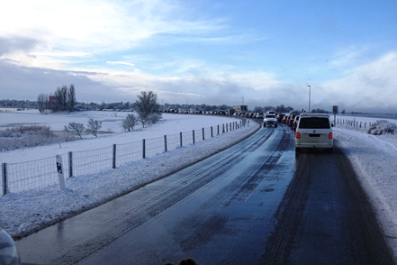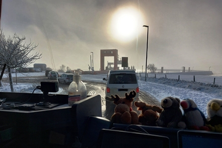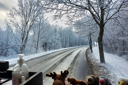 Die Temperatur sinkt, die Wettervorhersage für die nächsten Tage ist nicht gut. Es soll richtig kalt werden, vor allem aber soll es besonders hier im Norden anhaltend heftig schneien. So treffen wir die Entscheidung, nicht weiter zu fahren. Das ist uns angesichts des doch recht dichten Verkehrs und der zu erwartenden rutschigen Straßen zu kritisch. Wir machen uns auf den Heimweg, haben wir dort auch noch genug für die nächste Tour vorzubereiten. Auf mal mehr, mal weniger geräumten Straßen, selbst das kurze Stück Autobahn bei Itzehoe ist nur langsam zu befahren, fahren wir Richtung Elbfähre. Den Großraum Hamburg meiden wir, hier ist der Verkehrslagebericht katastrophal. Unterwegs ein lautes Klappern irgendwo am MAN. Zunächst einmal ist nichts festzustellen, aber später findet Peter heraus, dass einer unserer hinteren Stoßdämpfer vom Gummi abgerutscht ist. Der wird notdürftig befestigt, mehr geht jetzt am Straßenrand bei eisigen Temperaturen, Schneematsch, Schneegestöber nicht. Werkstätten natürlich alle geschlossen.