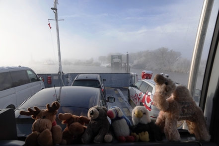 Diesmal ist die Fähre rappelvoll. Im Nebel sind die großen Vogelschwärme nur andeutungsweise zu sehen. Bald ist das andere Ufer bei Wischhafen erreicht.