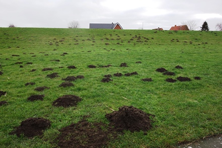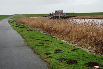 Am nächsten Morgen dann leider wieder dichte Bewölkung, aber zumindest ist es trocken. Knapp 30 km sind es von hier nach Friedrichskoog, wo es in der Nähe des alten Hafens direkt am Deich eine kostenlose Stellmöglichkeit für Wohnmobile gibt. Wir fragen uns, ob die unzähligen Maulwurfhügel auf den Rasenflächen der Deichstabilität zuträglich sind.