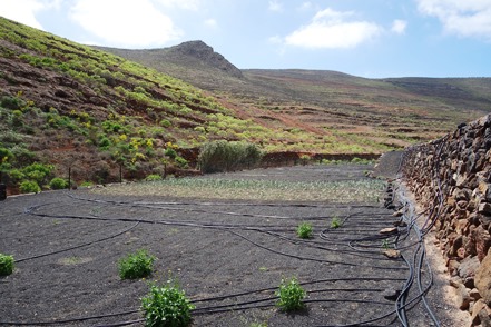 Anschließend suchen wir uns einen etwas windgeschützten Platz in einem Tal – hatte ich schon erwähnt, dass es immer noch sehr windig, wenn nicht stürmisch ist? Dort stehen wir zwar direkt am Weg, auf dem aber für den Rest des Tages bis auf zwei MTB-Fahrer und eine Joggerin niemand unterwegs ist – wenn man von den drei Quadtouren absieht, die vorbeifahren. Aber die sind schnell weg, und wir können hier noch etwas wandern und die schöne Vegetation bewundern. Wir sehen vereinzelt Felder, auf denen versucht wird, etwas Ertrag zu erzielen. Einige Vögel kriegen wir auch noch zu Gesicht, außerdem Ostkanareneidechsen. Auch hier wieder zahlreiche Theba-Schnecken im "Trockenschlaf".