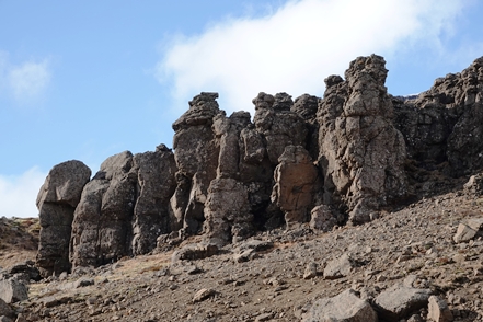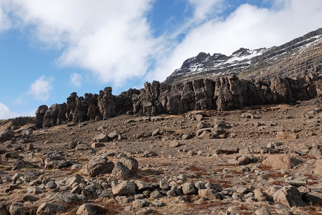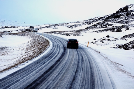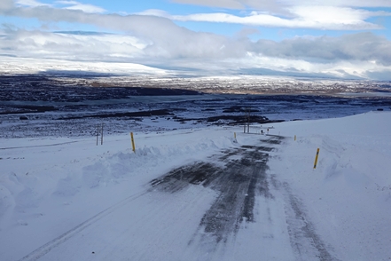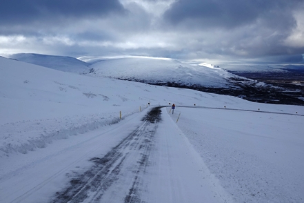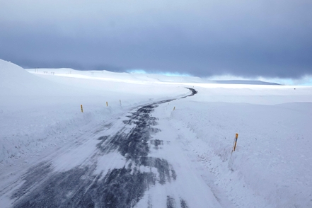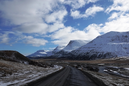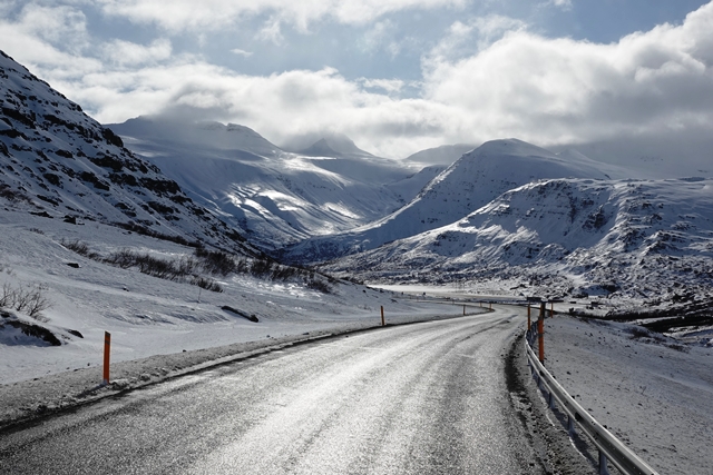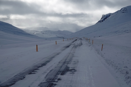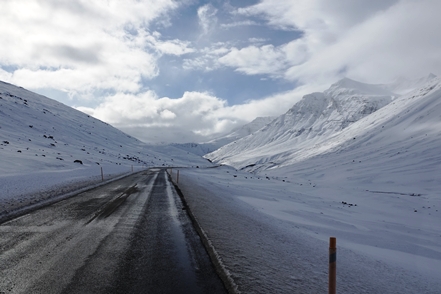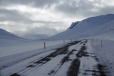 Die Wartezeit an Bord der Norröna im Hafen von Seyðisfjörður haben wir dazu genutzt, die Wetterprognosen für die nächste Zeit genau zu studieren. Nach Stand der Dinge erscheint es uns sinnvoller, im Uhrzeigersinn zu fahren, also zunächst auf der Ostseite der Insel gen Süden. Davor heißt es aber erst einmal, die Steigungspassage über die Fjarðarheiði zu schaffen. Konnten wir vor Abreise mehrfach beobachten, dass diese Strecke geschlossen (weil unpassierbar) war, ist sie heute offen, allerdings als schwierig gekennzeichnet. Und so ist es auch, wir sind froh über unsere Spikes, ist es doch teilweise recht rutschig. Das Wetter bessert sich zusehends.