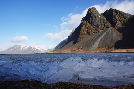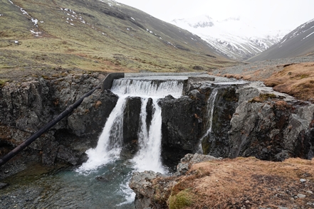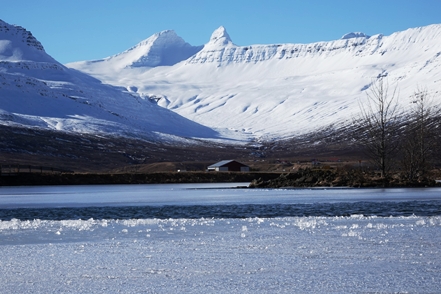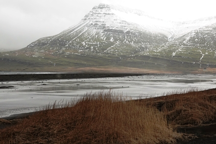 Der Schnee in tieferen Lagen wird weniger. Sehr weit fahren wir heute nicht mehr. In Faskruðsfjörður bleiben wir auf dem kleinen Campingplatz. Dieser ist zwar noch geschlossen, aber das Gelände ist zugänglich. So verbringen wir die erste Nacht auf Island in schöner Umgebung. Die Befestigung des Auspuffs wird kontrolliert und erneut in Ordnung gebracht. Wir können uns nur schwer erklären, wieso das Endrohr immer wieder aus dem Topf rutscht, obwohl die Schelle fest angezogen ist.