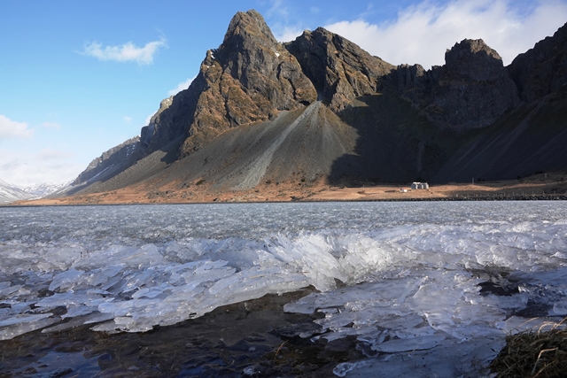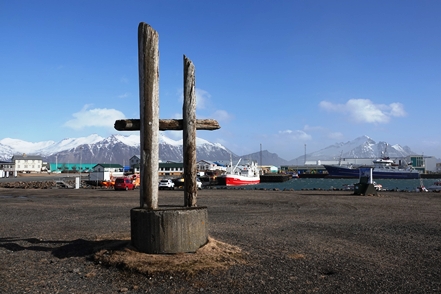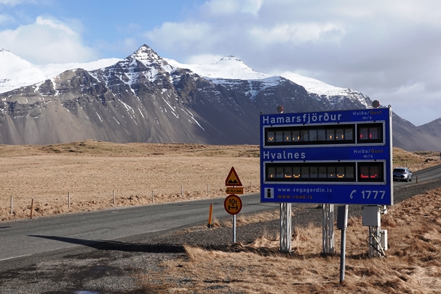 Wir fahren nach Höfn. Eine Infotafel an der 1 zeigt die Temperaturen und die Windgeschwindigkeiten (auf dem Foto leider nicht zu erkennen). 32 m/s, später sogar 36 sind schon heftig! In Höfn gibt es einen Netto-Supermarkt. Das Preisniveau ist wie erwartet leider genauso hoch wie in Egilsstaðir, aber das Angebot deutlich besser. Außerdem schauen wir uns im Ort ein wenig um, leider ohne längere Spaziergänge, da es dafür viel zu viel Wind hat. Wind sind wir ja durch unseren neuen Heimatwohnsitz durchaus gewohnt, aber das hier ist schon extrem.