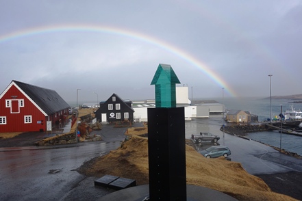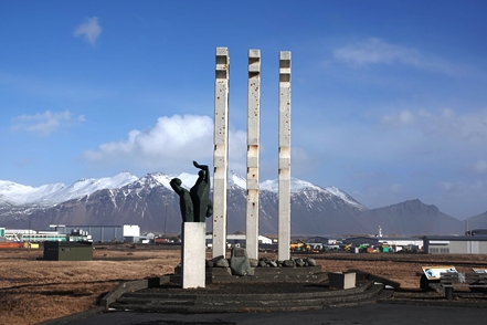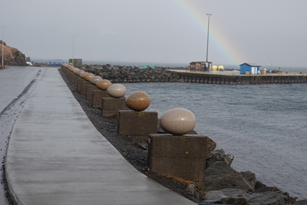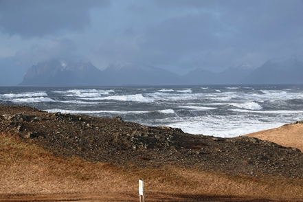 Das Kunstwerk Eggin i Gleðivik in Djupivogur besteht aus 34 großen Eiern, die jeweils für einen lokalen Vogel stehen. Schnell noch ein Blick auf den Ort, zum Herumlaufen ist es viel zu stürmisch, also geht es weiter. Allerdings nicht sehr weit, denn die 1 ist wegen des Sturms für die Weiterfahrt gesperrt. Was tun? Wir warten erst einmal ab, irgendwann sehen wir wieder Autos fahren. Schnell die Straßenbedingungen gecheckt – richtig, die 1 ist wieder für den Verkehr freigegeben. Also fahren wir weiter. Die Böen sind teilweise extrem, irgendwann macht das Weiterfahren keinen Sinn mehr. Wir werden diesen Sturm erst einmal aussitzen.