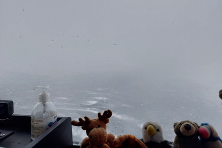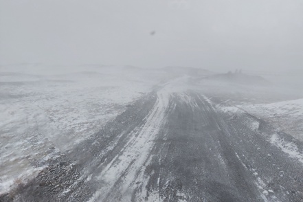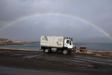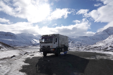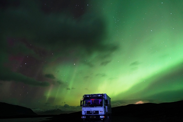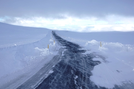 Später fängt es dann zunächst an zu schneien, fahren können wir nicht, da Teile der Ringstraße wieder gesperrt sind. In der Nacht nimmt der Wind erneut so stark zu, dass an Schlaf nicht zu denken ist. Mehrmals stellen wir den MAN um, drehen ihn in den Wind, der leider des öfteren die Richtung wechselt. Das nervt ganz gewaltig. Morgens fahren wir im Sturm ein Stück weiter bis zu einer Stelle, wo der Wind etwas weniger tobt. Hier warten wir einige Stunden ab, zumal auch die Straßenverhältnisse sehr schlecht sein sollen.