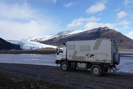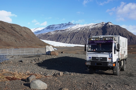 Eine holprige Piste bringt uns zum Ausgangspunkt einer kurzen Wanderung zum Wasserfall Skutafoss. Aber wir sind froh, als wir wieder zurück beim MAN sind und so aus dem Wind kommen.