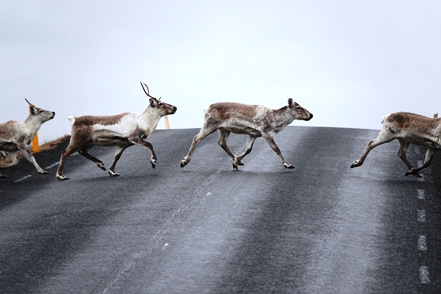 Am nächsten Morgen dann leichter Regen. Wie schade! Das Wetter heute ist ein Mix aus Regen/Bewölkung/mal etwas Sonne, leider immer verbunden mit heftigem Wind! Immer wieder kreuzen Rentiere vor uns die Straße. Teilweise sehen wir große Herden entlang des Weges.