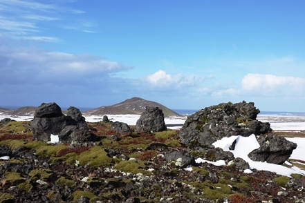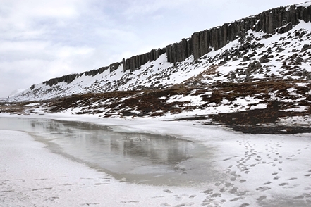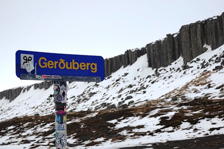 Auf einem schlammigen Schotterweg erreichen wir bei leider trübem Wetter auf der Halbinsel ein Ziel, das wir bisher immer ausgelassen haben. Die Basaltklippen von Gerðuberg sind entstanden aus Lava, die nach Abkühlen durch das Meer in gleichmäßigen Säulen erstarrt sind. Die Rauðamelskirkja können wir leider nicht näher anschauen, da hier gerade eine Hochzeit stattfindet. Am Nachmkittag klart es ein klein wenig auf.