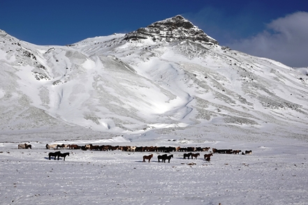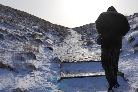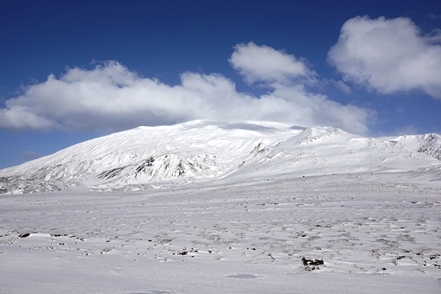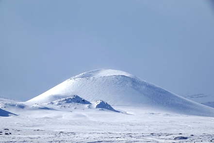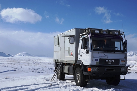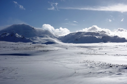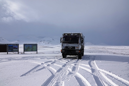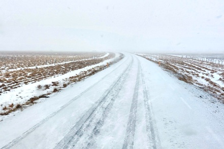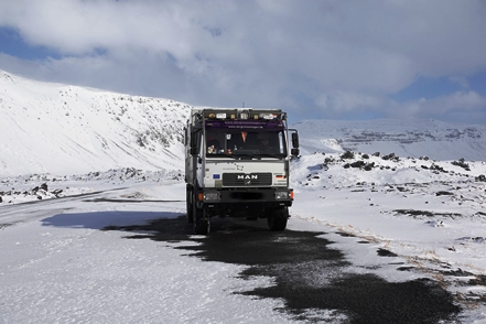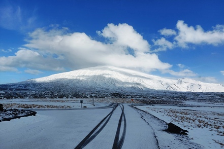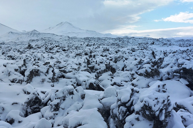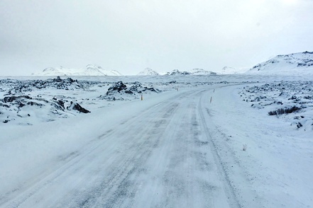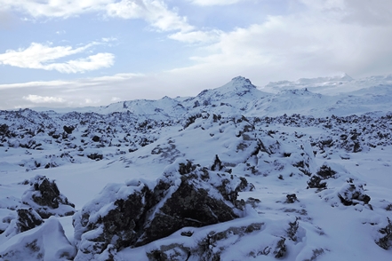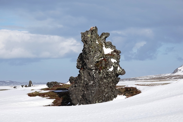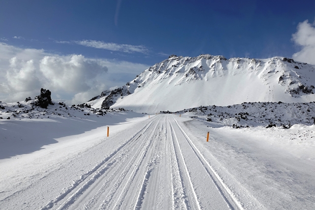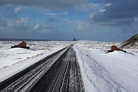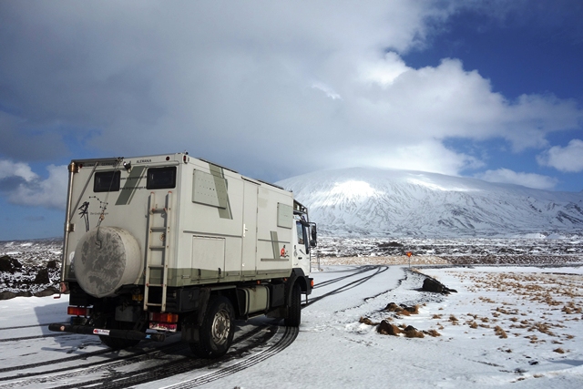 Nachts hat es heftig geschneit, so dass wir davon absehen, weiter in das Gebiet hinein zu fahren, zumal man den Verlauf der Piste nur noch erahnen kann. Zumindest wissen wir, wie der Weg zurück verläuft. Auf verschneiten Straßen geht es weiter, wobei wir noch schöne Ausblicke auf die Lavalandschaft haben.