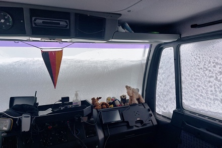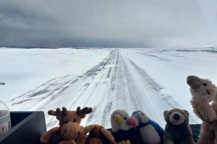 Das Wetter ist ein ständiger Wechsel zwischen strahlender Sonne, Wolken, Düsterness, Schneesturm – und das innerhalb von Minuten. Teilweise ist absolut nichts zu sehen. Da macht das Weiterfahren wieder einmal keinen Sinn, zumal Straßen, die wir eigentlich fahren wollen, entweder als gesperrt oder zumindest als schwierig zu fahren eingestuft sind. Auf einem Parkplatz bleiben wir deshalb einfach stehen. Fotografiert haben wir natürlich fast ausschließlich in den Gut-Wetter-Phasen.