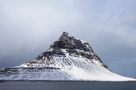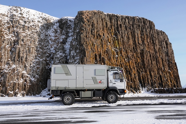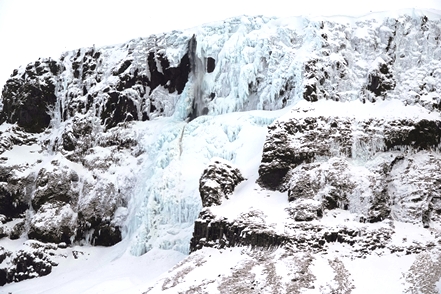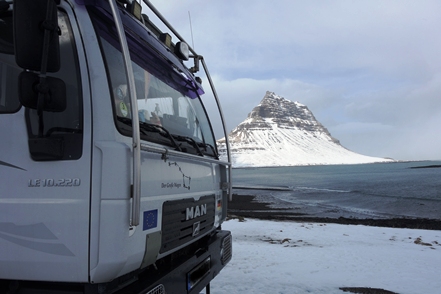 Auf der Weiterfahrt entdecken wir wie auf unserer Skandinavientour zahlreiche Eiskaskaden. Es klart zumindest soweit auf, dass wir einen Blick auf den eindrucksvollen Berg Kirkjufell werfen können. Dass wir mal wieder das Auspuff-Endrohr befestigen müssen, sei nur der Vollständigkeit halber erwähnt.
