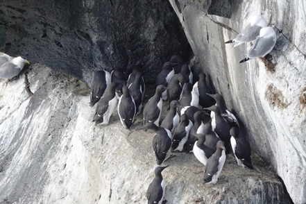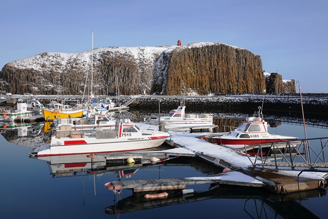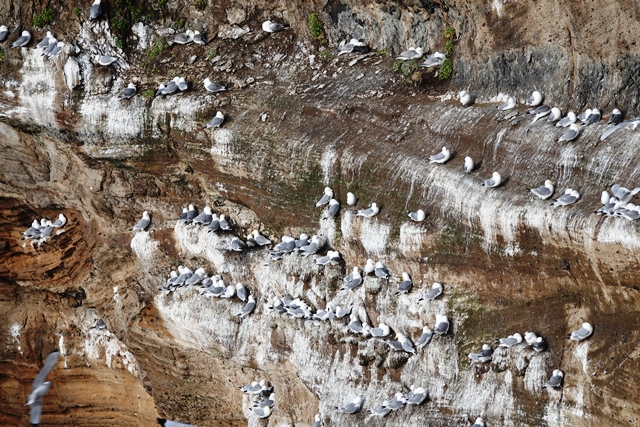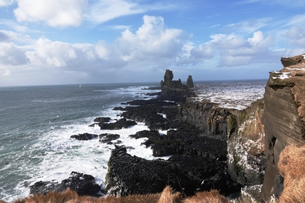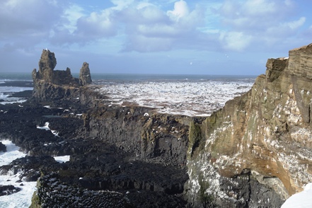 Bald ist der Snæfellsjökull Nationalpark erreicht. Wir stellen den Großen Wagen auf dem (noch) kostenlosen Parkplatz bei Malarrif mit Blick auf den Stratovulkan Snæfellsjökull ab und laufen vorsichtig – es ist stellenweise spiegelglatt – in Richtung der eindrucksvollen Lóndrangar-Felsen. Die steilen Klippen sind bereits gut besetzt von unzähligen Dreizehenmöwen, auch etliche Trottellummen entdecken wir. Wieder macht der starke Wind das Fotografieren zu einer Herausforderung.