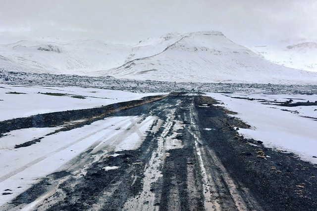 Eigentlich wollen wir die Straße 558 in die Lavawüste Berserkjahraun nehmen, aber diese scheint eher nicht fahrbar zu sein. So nehmen wir eine Schotterpiste, die ins Gebiet führt. Aber auch diese scheint uns gerade auch angesichts der Wettervorhersage nicht ganz sicher zu sein. So stoppen wir vor einem längeren Gefälle und fahren nicht weiter.