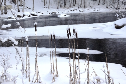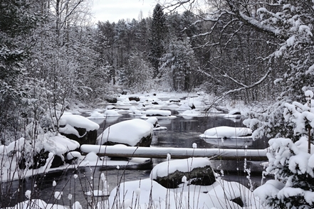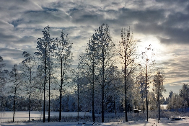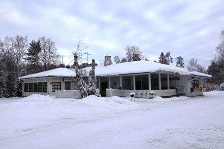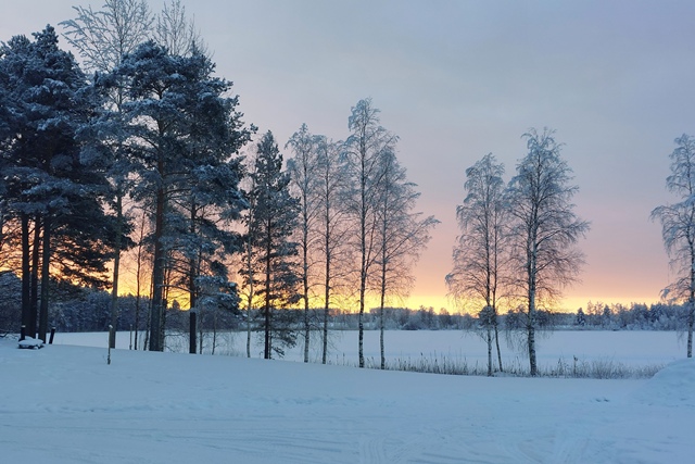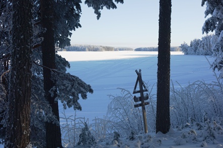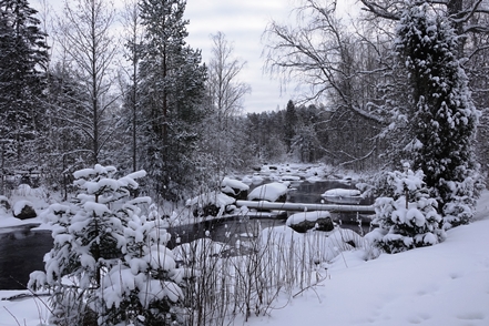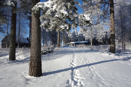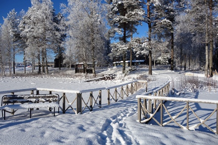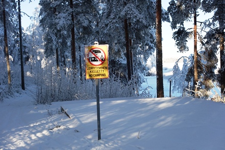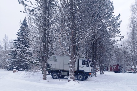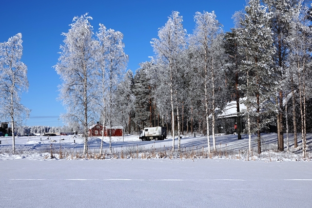 Am frühen Nachmittag ist es dann soweit. Reparatur erledigt, wir können weiterfahren. Endlich wieder unterwegs. Wir haben schon andere Pannen gehabt, konnten da aber meist etwas unternehmen, was es nicht ganz so schlimm machte. Aber so gar nichts unternehmen können, war schon ganz schön nervig. Pünktlich beginnt es zu schneien, so dass wir im Schneegestöber unterwegs sind. Etwa 80 km weit fahren wir noch, dann biegen wir ab auf einen verschneiten Weg und erreichen nach gut 400 m den Camping Koskenniemi. Wir stehen gut und ruhig bei leider trübem Wetter in schöner Umgebung. Vor allem aber haben wir Landstrom, der es uns bei den wieder sinkenden Temperaturen – in der Nacht auf etwa minus 20 – ermöglicht, die Gasvorräte zu schonen und mit Strom zu heizen, vor allem aber auch am Morgen den Motorvorwärmer des MAN in Betrieb zu nehmen. Auch hier unternehmen wir leider weiter nichts, ist es doch bei angeschlagener Gesundheit ratsam, zu große Kraftanstrengungen zu unterlassen.