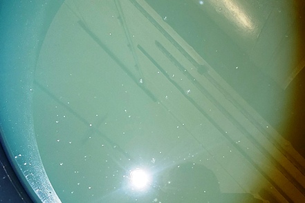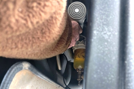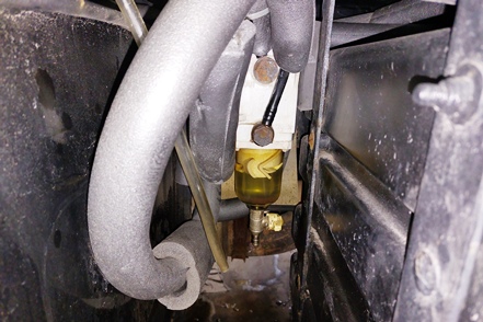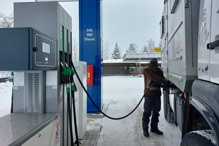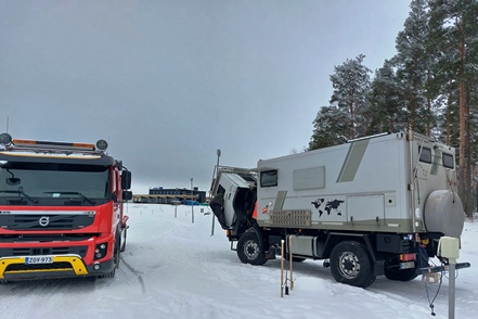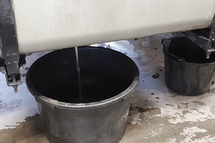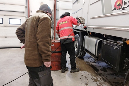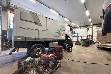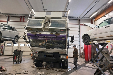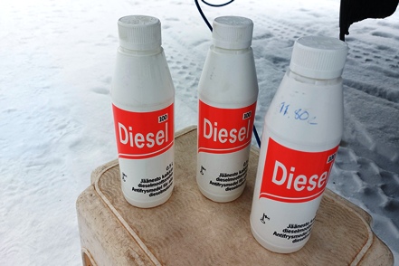 Die Temperaturen sind wieder gestiegen. Am Montag morgen erscheint ein Mechaniker von Auto Osix. Ein Blick in den Tank bestätigt unsere Diagnose - Eiskristalle im Diesel. Wie schon vermutet haben wir Wasser im Diesel, wahrscheinlich beim Tanken von Winterdiesel in Helsinki erwischt. Der Mechaniker besorgt ein Additiv, das Wasser binden soll. Peter hat in der Zwischenzeit bereits die Leitungen zu den Einspritzdüsen gelöst und den Anlasser drehen gelassen. Mit Unterstützung des Mechanikers klappt es dann letztendlich. Der MAN springt wieder an. Wir fahren die kurze Strecke bis zur Werkstatt. Von alleine wären wir nicht auf die Idee gekommen, hierher zu fahren. Es handelt sich nämlich um einen Autoverwerter, wo Totalschaden-Fahrzeuge ausgeschlachtet werden, aber wie wir sehen nimmt man auch Instandsetzungsarbeiten vor. Die Jungs machen einen professionellen Eindruck. Der Übeltäter-Tank wird abgepumpt (wir haben zwei, die aber Gottseidank voneinander getrennt und unabhängig sind). Der Rest wird dann nach unten abgelassen, besonders hier sind die Eiskristalle deutlich zu sehen. Die Filter usw. werden gereinigt, frischer Diesel eingefüllt. Der MAN springt ohne Probleme an.