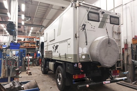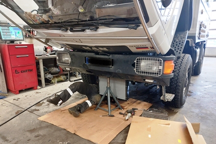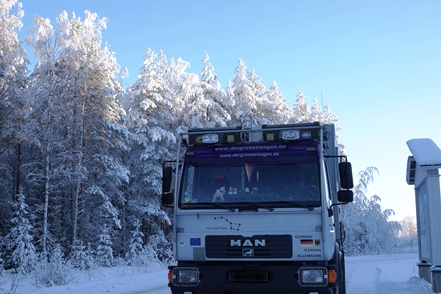 Wie Ihr bereits wisst, stehen wir auf einem Werkstatthof und warten auf die Lieferung des benötigten neuen Kühlers. Wir stehen Gottseidank etwas geschützt und abgeschirmt, so dass die Wartezeit erstaunlich ruhig verläuft. Unternehmen tun wir absolut nichts, ist doch Christine gesundheitlich stark angeschlagen. Abends gibt es jeweils ein „schnelles“ Essen ohne große Kochorgien. Einmal holen wir uns auch wirklich leckere Pizzen beim Big Chef, die dann für zwei Tage reichen. Ist es zunächst noch eisig kalt (minus 23 Grad), so steigen die Temperaturen während unseres Zwangsaufenthalts stetig bis auf minus 7 Grad an. Am Dienstag müssen wir dann leider umziehen, der Bremsenprüfstand, an dem wir stehen, wird benötigt. Nun ist es deutlich unruhiger, und so sind wir froh, als es Mittwoch morgen klopft. Der MAN kann in die Werkstatt, die Arbeiten beginnen. Unser alter Kühler hat zwei Mini-Löcher.