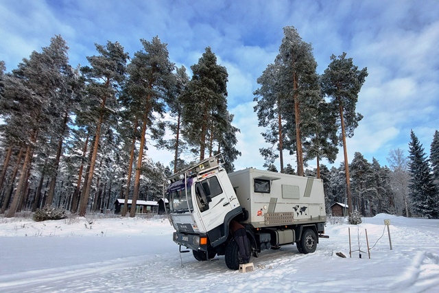 Am nächsten Morgen geht es zunächst gut voran, dann beginnt zusätzlich zu Christines Reizhusten der Motor wieder mit Husten, sprich Ruckeln. Wir fahren an einer Automatentanke ab und fönen den Separ, bis sich das Eis darin gelöst hat und als Wasser abgelassen werden kann. Der Separfilter erfüllt seinen Job, Wasser abzuscheiden. Aber das ist angesichts der niedrigen Temperaturen leider kontraproduktiv, da dieses einfriert und damit den Filter verstopft, zumindest wenn es zu viel Wasser ist (was sich später als zutreffend erweisen wird!). Das Fönen müssen wir unterwegs noch einmal wiederholen, der MAN läuft dann wieder reibungslos. Angesichts der angesagten noch deutlich kühleren Temperaturen nehmen wir Abstand von unserem ursprünglichen Plan Richtung Kuopio zu fahren, sondern weiter geht es Richtung Oulo.