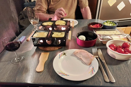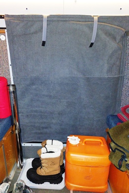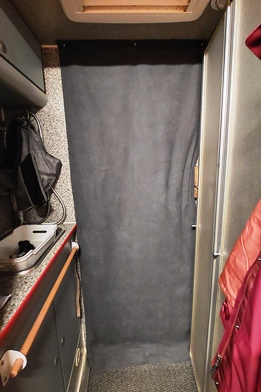 Heute gibt es ein Käsefondue. Da es in der Nacht noch einmal kälter werden soll, bringen wir auch an der Eingangstür unseren extra genähten Thermovorhang an, der verhindert, dass beim Ein- und Aussteigen zu viel Wärme entweicht. Vorne an der (isolierten) Schiebetür zum Fahrerhaus haben wir auf beiden Seiten ebenfalls Thermovorhänge angebracht, die wir hier sowieso bei jedem Aufenthalt nutzen und die sich durchaus bewährt haben. In der Nacht hat es dann minus 28 Grad.