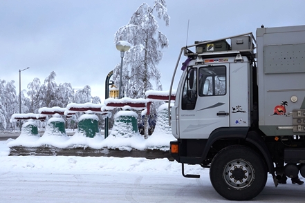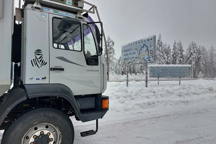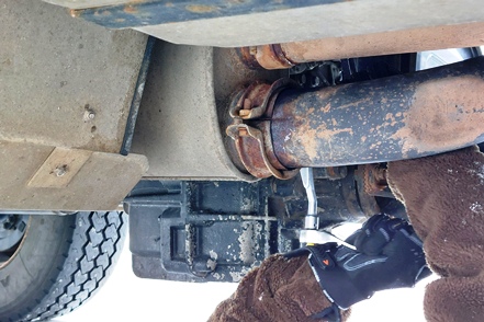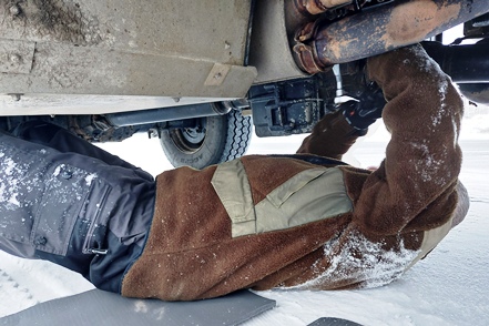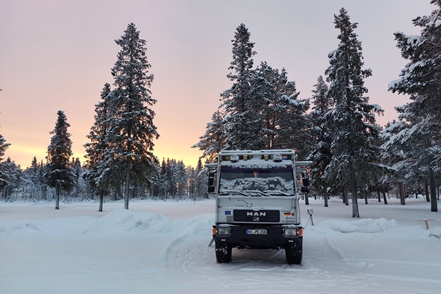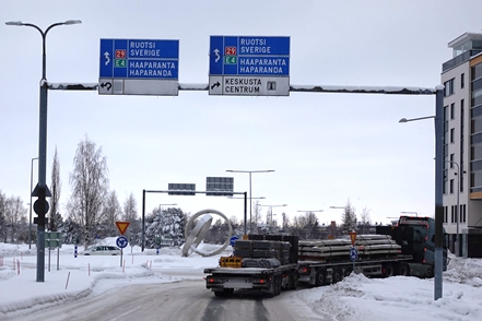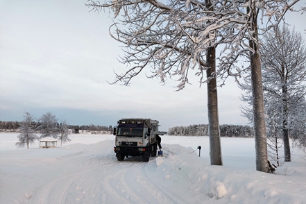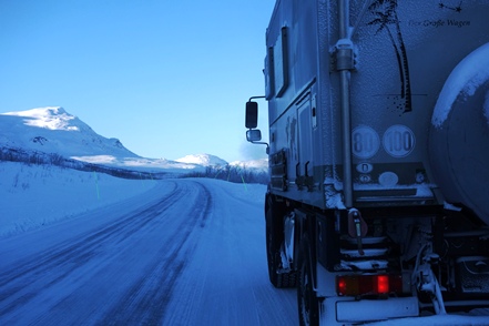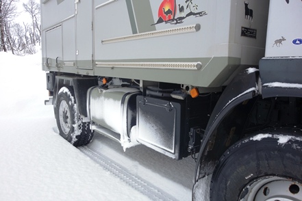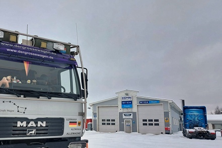 Bei schlechter Sicht und viel Verkehr geht es weiter Richtung Grenze. In Kemi tauschen wir beim Baumarkt Puuilo unsere finnische Gasflasche gegen eine volle, stellen dabei fest, dass sich das Auspuffendrohr gelöst hat und droht auf die vordere Kardanwelle zu schlagen. Nicht schon wieder! Es ist eisig kalt, Peter geht es immer noch nicht gut. So kann er sich nicht unter den Wagen legen. Aber Gottseidank finden wir mit Truck Kemin eine kleine LKW-Werkstatt, die uns das Rohr sogar kostenlos wieder befestigt. So viel sei aber gleich erwähnt, das wird nicht das letzte Mal sein, dass sich das Rohr löst!