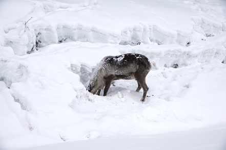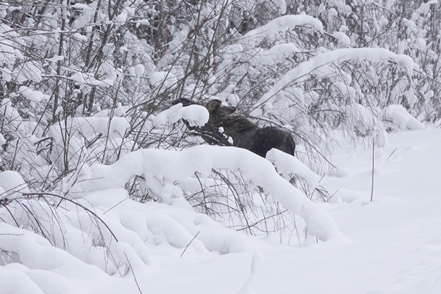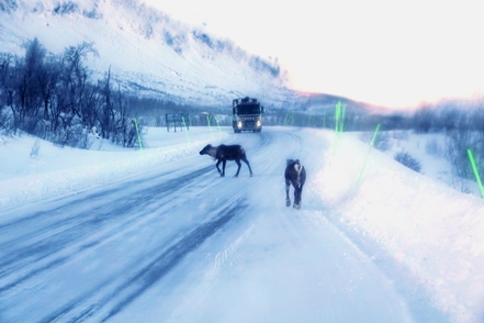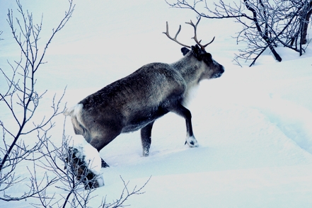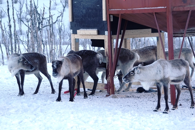 Wir überqueren den Polarkreis. Die beiden Elche, die wir sehen, sind sehr fotoscheu und verschwinden schnell hinter den Bäumen, das Rentier lässt sich bei der Nahrungssuche nicht stören. Leider kann man nicht einfach anhalten um zu fotografieren, dafür ist zu viel Verkehr.