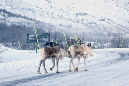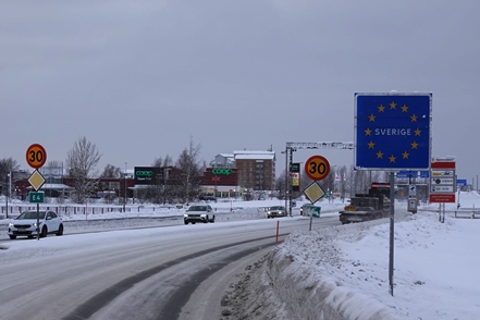 Unterwegs sehen wir dann noch zahlreiche Rentiere. Bei fantastischem Wetter und Fahrt durch großartige Landschaft erreichen wir bald die Grenzstation Riksgränsen, wo wir Schweden erst einmal verlassen.