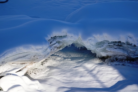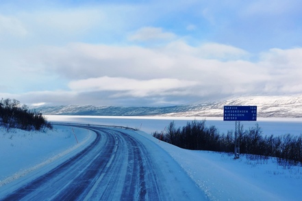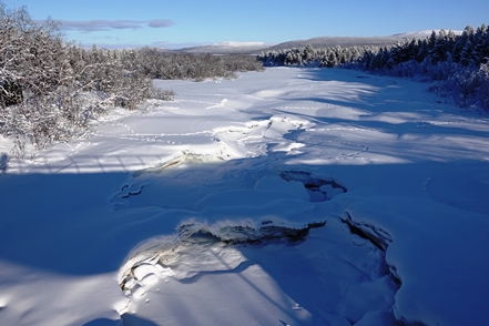 Danach geht es Richtung norwegische Grenze. An einem vereisten Fluss lohnt natürlich ein Fotostopp.