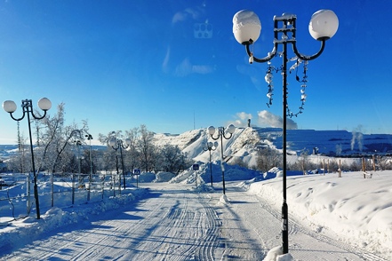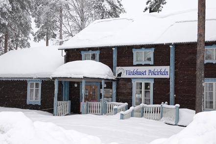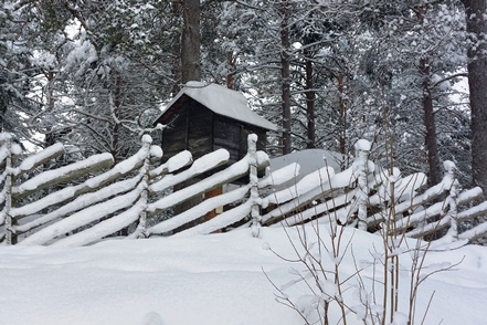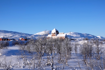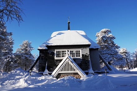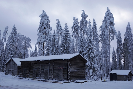 Am nächsten Morgen eine schöne Lichtstimmung, die leider bald wieder trüberem Wetter Platz macht. Noch ein kurzer Gang durch das direkt benachbarte kleine Freilichtmuseum. Bald setzt Schneegestöber ein, was die Weiterfahrt nicht so angenehm macht. Aber zumindest sind aufgrund der Kälte die Straßen nicht glatt, so dass wir recht zügig vorankommen.