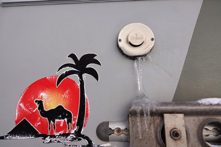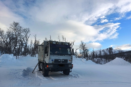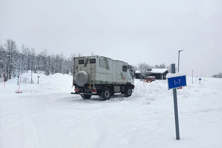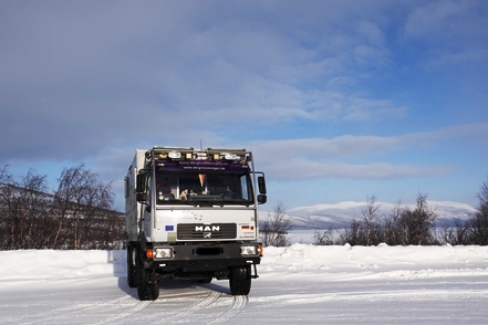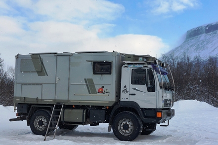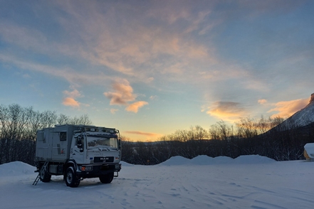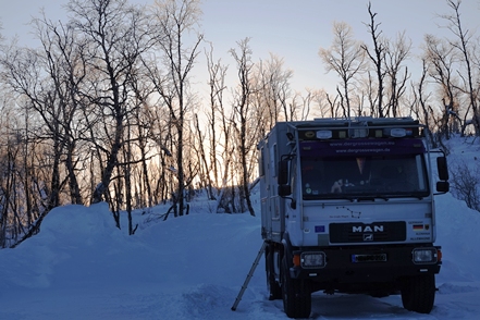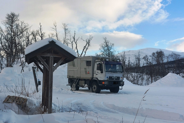 Am nächsten Morgen haben wir minus 24 Grad, der MAN ist total befroren. Selbst mit Enteiserspray ist die Frontscheibe nicht freizubekommen. Wir sehen, dass in der Nacht noch ein PKW-Camper gekommen ist. Das wäre nichts für uns.