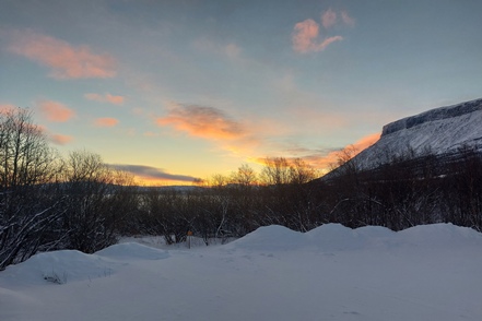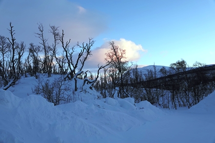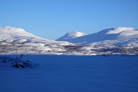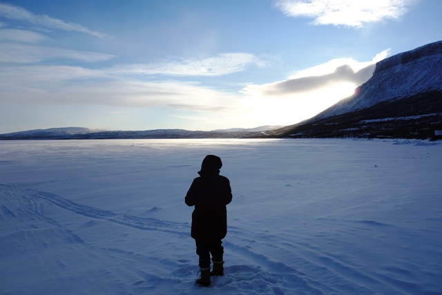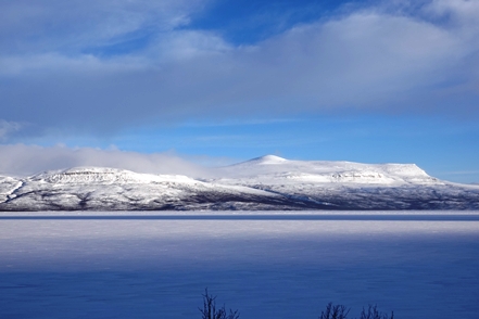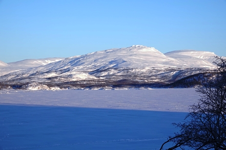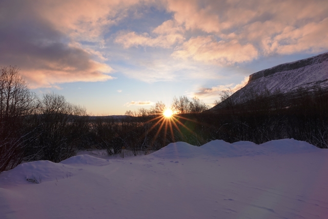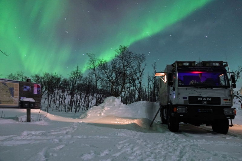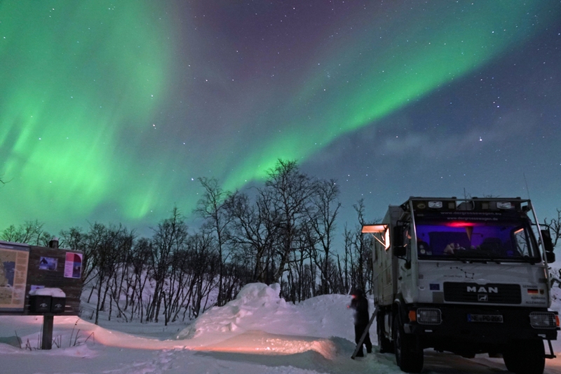 In großartiger Landschaft finden wir dann am Torneträsk endlich einmal einen freien Stellplatz, der zugänglich ist. Ohne Allrad käme man allerdings sicher nicht mehr zurück auf die Straße. Das Problem diesen Winter ist die große Schneemenge, so dass freie Plätze in der Regel nicht zugänglich sind. Selbst auf Rastplätzen wird häufig nicht geräumt. Hier an diesem Platz sehen wir nachts aus dem Bett dann tatsächlich die ersten (schwachen) Polarlichter, können uns allerdings nicht aufraffen, hinaus in die Kälte zu gehen.