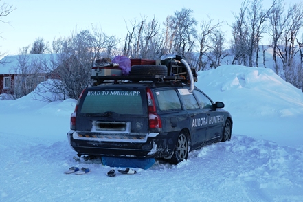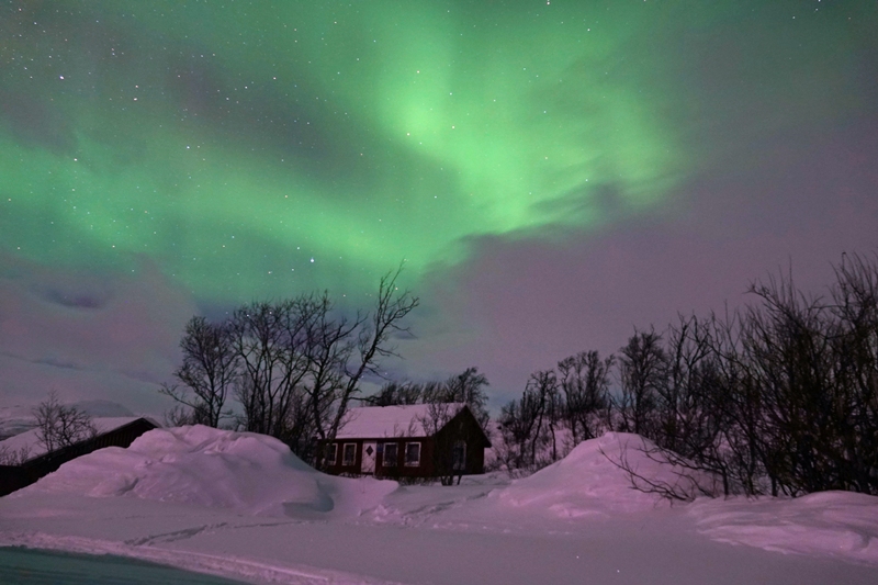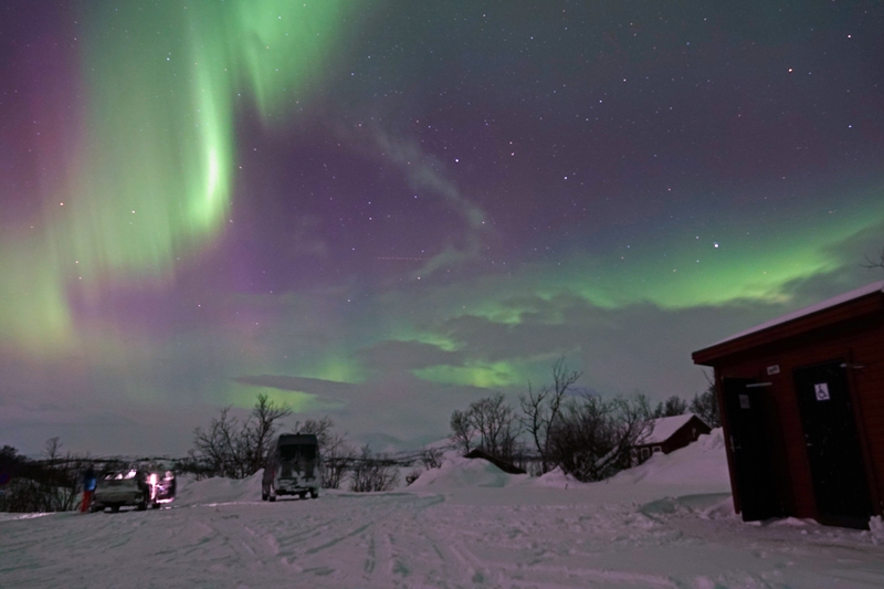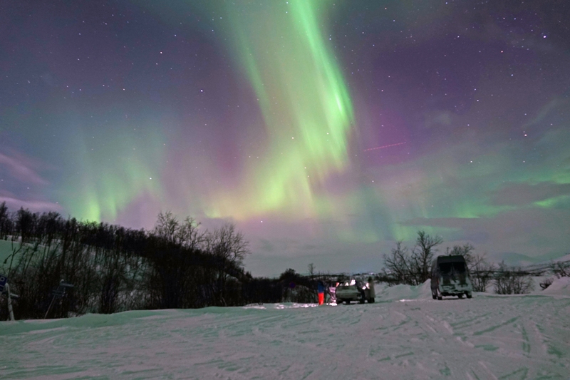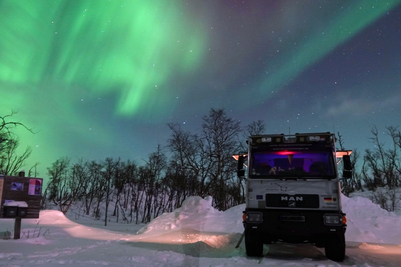 Bald zieht es sich leider zu und beginnt zu schneien. Wir richten uns auf einem ordentlichen Rastplatz ein, ist doch die Nordlichtvorhersage für heute ausgesprochen gut und tatsächlich auch zutreffend. Es klart immer weiter auf.
