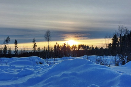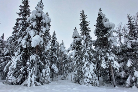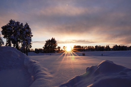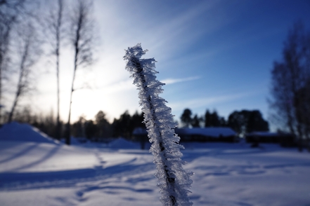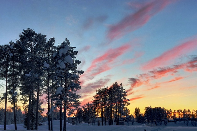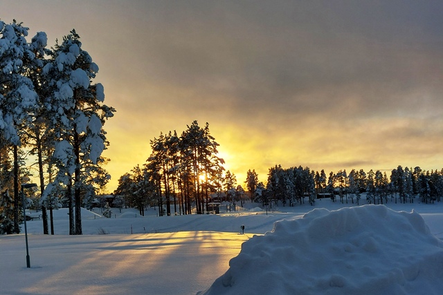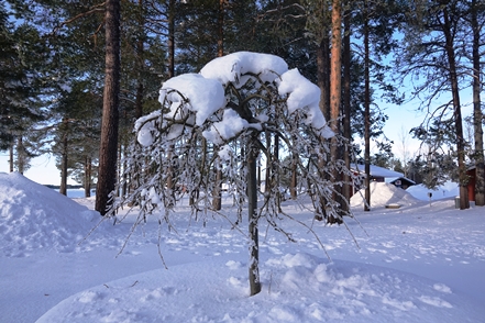 Am nächsten Morgen dann wieder minus 12 Grad. Leider dichter Nebel. Es dauert recht lange, bis dieser sich auflöst, aber ab Mittag haben wir dann wieder klares Wetter, so dass einem Spaziergang nichts im Wege steht. Außerdem probieren wir die typischen skandinavischen Tretschlitten (Spark) aus. Macht Spaß, aber ist tatsächlich anstrengender als vermutet.