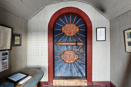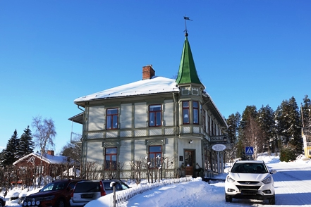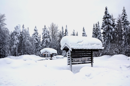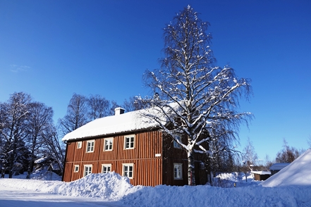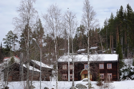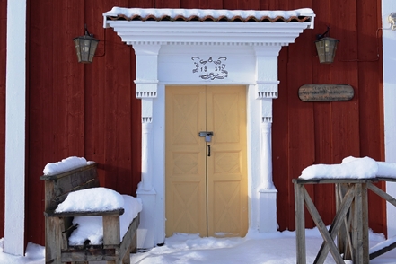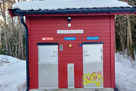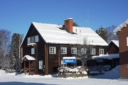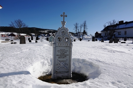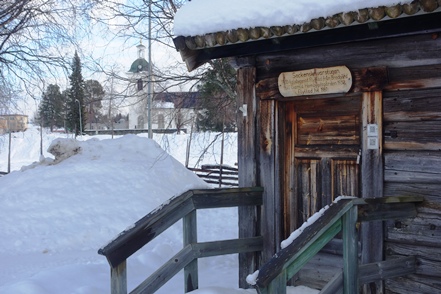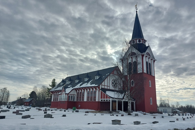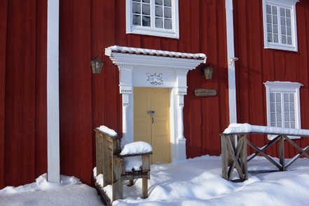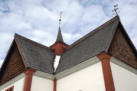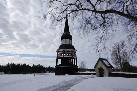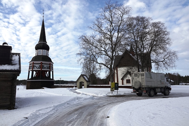 Peter hat das abgerutschte Teil wieder verklebt, und so können wir am nächsten Morgen in Ytterhogdal erneut Wasser füllen, natürlich nicht ohne akribische Kontrolle während des Vorgangs, ob auch wirklich alles dicht ist. Im kleinen Ort Älvros bewundern wir die Neue und die Alte Kirche. Leider sind die eigentlichen Kirchen verschlossen. Es ist spiegelglatt auf den Wegen, so dass wir uns nur mit äußerster Vorsicht bewegen können; es zieht einem regelrecht die Füße weg.
