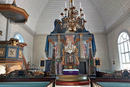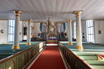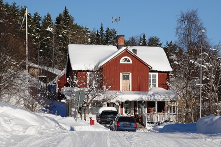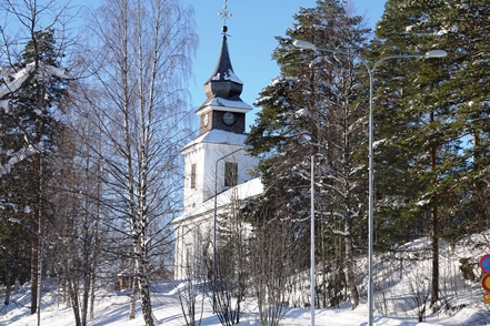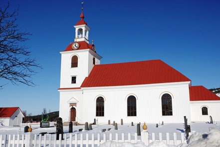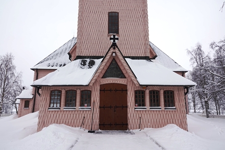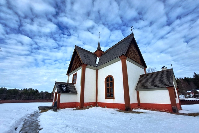 Auf der Weiterfahrt nutzen wir eine Wasserfüllstation zum Befüllen unseres Wassertanks. Auch unser Dieseltank soll Nachschub erhalten. Seltsam, bei zwei Tanken klappt das nicht – kein Sprit. Bei der dritten geht es dann. Auch hier in Schweden sind die Preise „explodiert“, wir zahlen gut 30 ct/l mehr als beim letzten Mal. Eigentlich wollen wir eine Nebenstrecke fahren, erhoffen wir uns dort doch noch mehr Schnee, vor allem aber weniger Verkehr, denn der hat jetzt zuletzt etwas zugelegt. So biegen wir hinter Asarna ab und fahren Richtung Hede. Aber unser Erwarten stellt sich als Irrtum heraus. Hier ist deutlich mehr Verkehr als auf der Hauptstraße, wir denken, dass es Skitouristen sind. So fahren wir nur bis Klovsjö, wo wir uns die schöne Kirche anschauen. Danach geht es zurück zum Inlandsvägen.