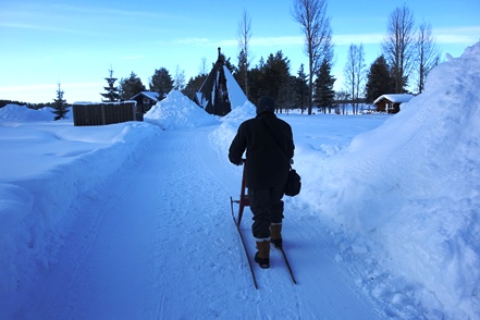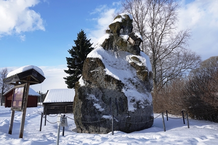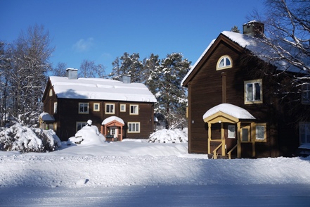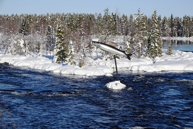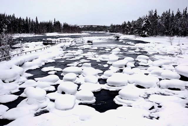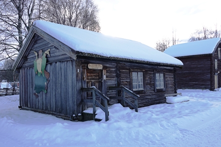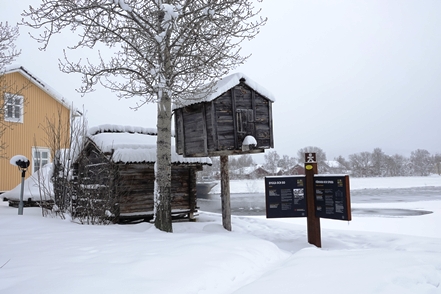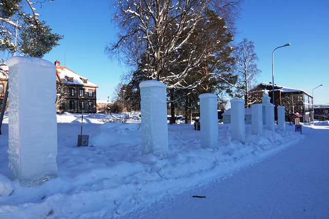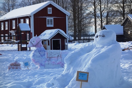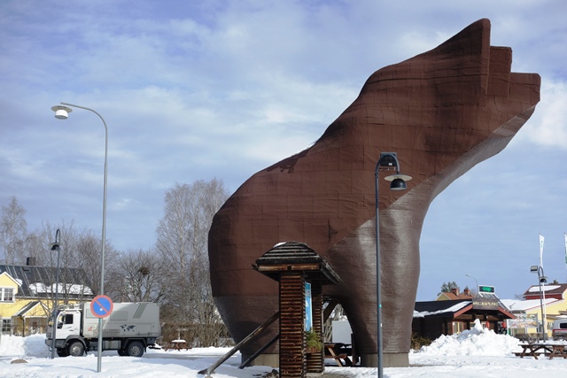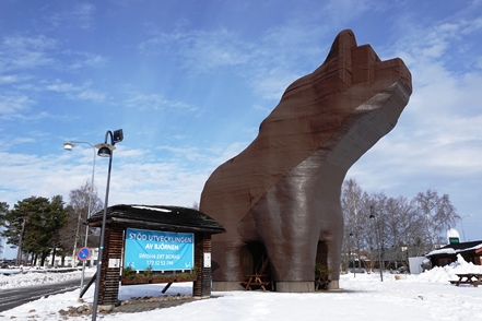 Es wird immer wärmer. Morgens ist es „nur“ noch um den Gefrierpunkt. In Strömsund schauen wir uns das nette Heimatmuseum (Hembygdsgard) an, wo es außerdem den Jätten Jorm, eine etwa 6 m hohe Statue, zu sehen gibt. Die Figur stammt aus dem schwedischen Film Dunderklumpen. Auch hier sehen wir wieder Spuren eines Wettbewerbs. Für uns sieht es so aus, als würden hier Schulklassen größere Gebilde aus Schnee konstruieren.