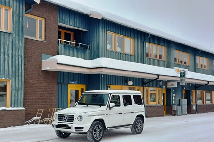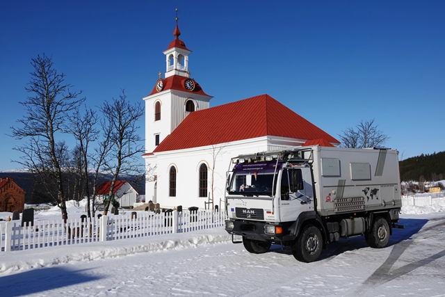 Bald ist Arjeplog erreicht. Gelegenheit, in der Apotheke unsere Medikamentenvorräte aufzustocken, ist doch die Gesundheit immer noch nicht wieder so richtig hergestellt. Auch hier im Ort viele deutsche Begegnungen. Den Mercedes vor der Apotheke haben wir unterwegs bereits mit einer Testkolonne gesehen. Der Fahrer eines anderen Begleitfahrzeugs berichtet uns, dass es dieses Jahr gut 10 Grad kälter sei als sonst und dass sehr viel mehr Schnee gefallen ist. Das deckt sich mit unseren Beobachtungen. Ein kurzer Gang zur Kirche, das Silbermuseum haben wir früher schon besucht, lassen wir also aus.