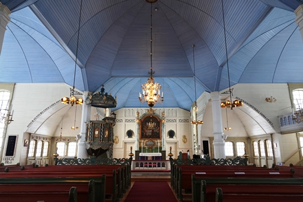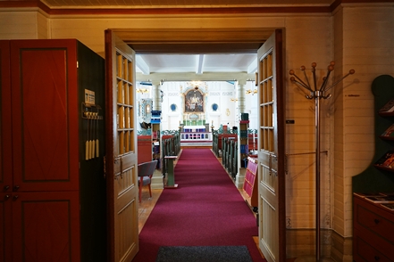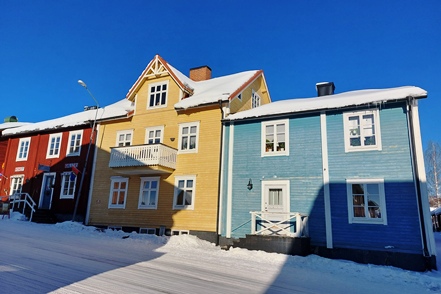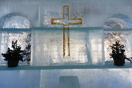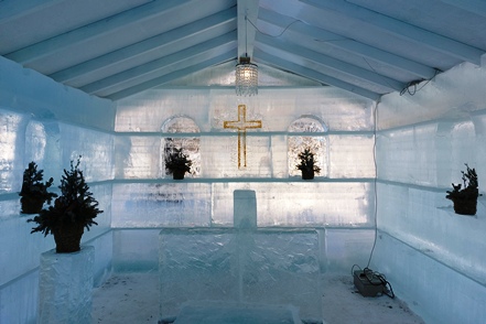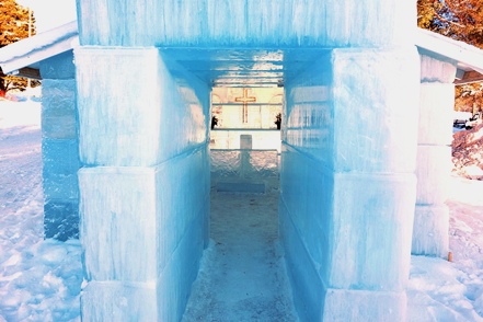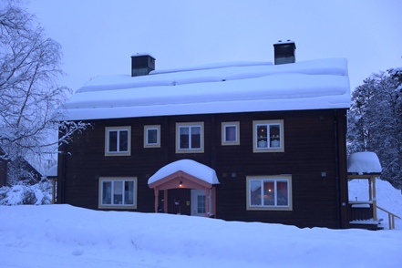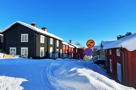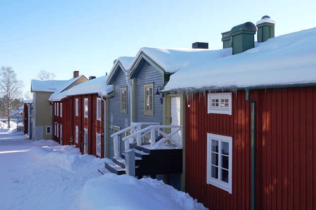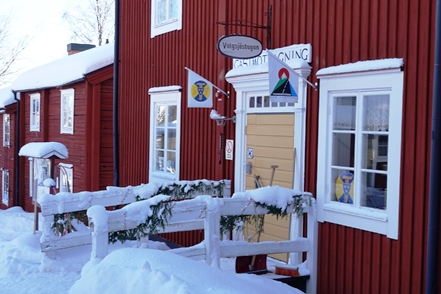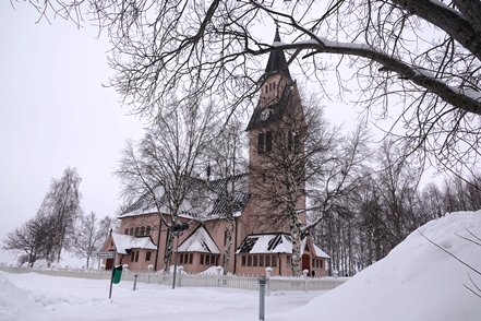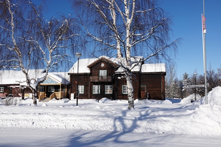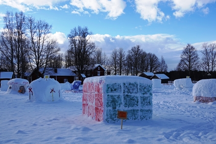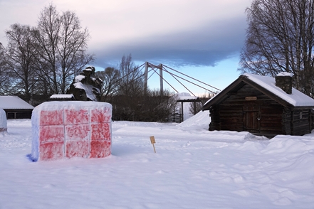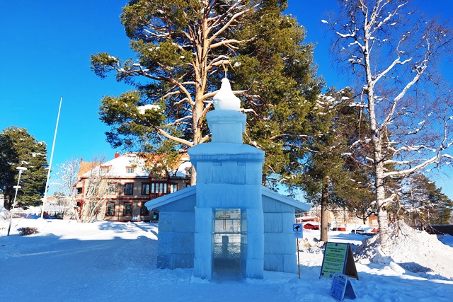 In Vilhelmina schauen wir uns schöne Häuser und die sogenannte Kyrkstad mit etwa 20 Gebäuden aus dem 18. Jahrhundert an. Natürlich gehen wir auch in die kleine Eiskapelle, eine vergängliche Attraktion, genau wie die Eisblöcke direkt bei der Kapelle. Diese dienen einem skurrilen Wettbewerb. Mutige Wettbewerber lassen sich auf diesen Blöcken nieder und trotzen den eisigen Temperaturen. Alle paar Stunden gibt es eine kurze Pause. Mindestens 48 Stunden müssen sie durchhalten, in diesem Jahr waren es angeblich sogar 66, um zu gewinnen.