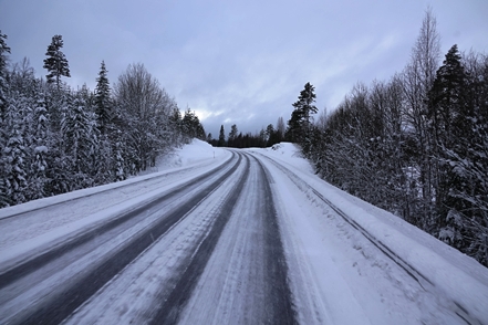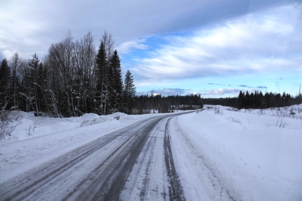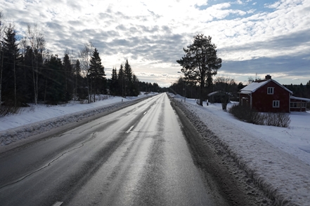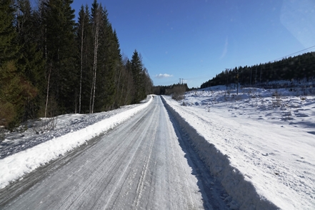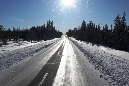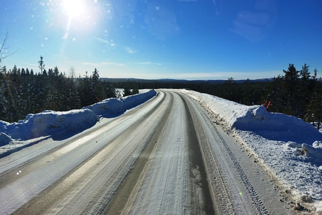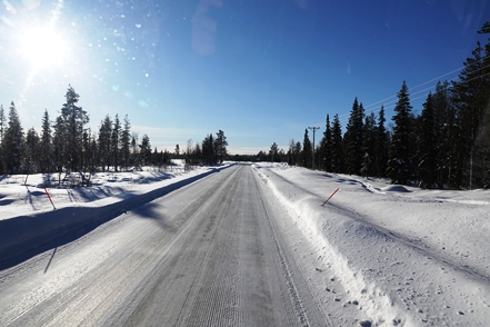 Anschließend verlassen wir Storuman, ein wenig Strecke müssen wir heute noch machen. Da es dabei ist wärmer zu werden, sind die Straßen ein wenig glatt, aber insgesamt kein Problem. Wieder sind wir froh über unsere Spikes.
