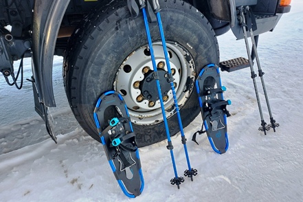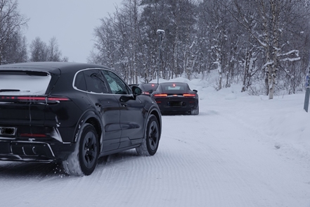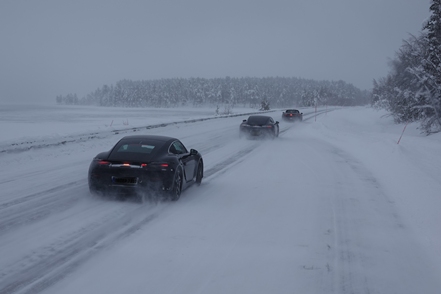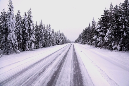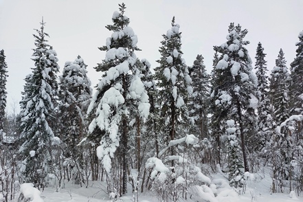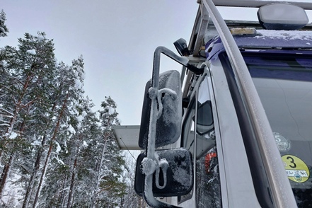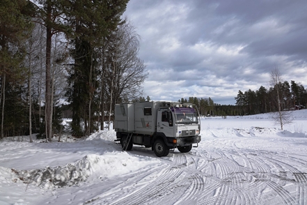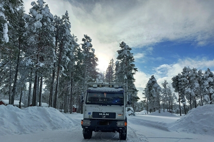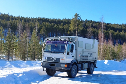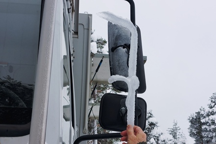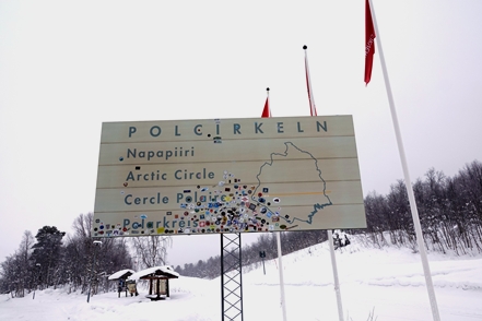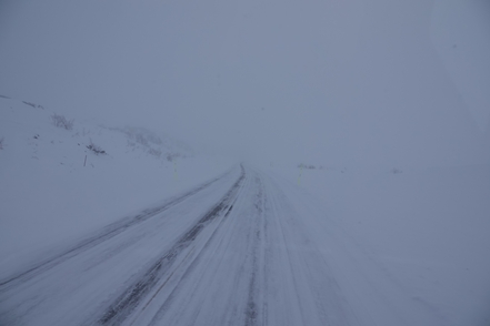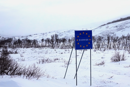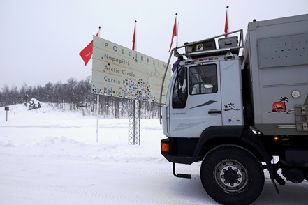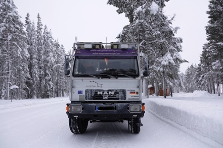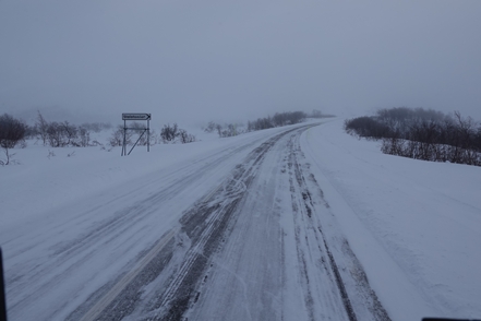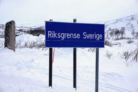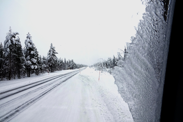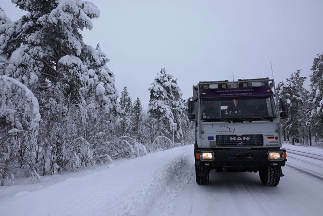War schon die Fahrt durchs Junkerdal von trübem Wetter beeinträchtigt geht es dann nach Grenzüberfahrt nach Schweden erst so richtig los. Es wird zusehends nebliger, die Feuchtigkeit gefriert sofort auf dem Fahrzeug, leider auch auf den Scheiben. Selbst unser unverdünntes Scheibenfrostschutzmittel löst das Problem immer nur kurzfristig. Schlechte Sicht und damit noch vorsichtigeres Fahren ist angesagt. Gottseidank ist weiterhin wenig Verkehr, aber es ist natürlich schade für die wie wir wissen schöne Landschaft. Bald ist der Polarkreis erreicht. Die wenigen Fahrzeuge, denen wir begegnen, sind häufig solche mit deutschen Kennzeichen, in der Regel in Kolonne unterwegs. Es handelt sich um Testfahrzeuge der unterschiedlichsten bekannten Automarken, die hier im Bereich Wintertests im großen Stil durchführen.