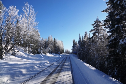 Leider ist es auch am nächsten Tag trüb, die Temperaturen liegen bei minus 7 Grad. Weiter geht es durch die tiefverschneite Landschaft. Die Plätze, die wir hier an der Strecke von früheren Reisen her kennen, sind alle nicht zugänglich.
