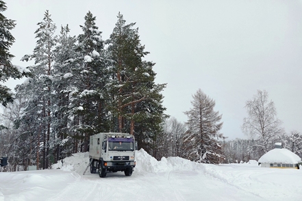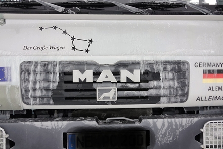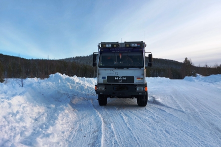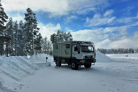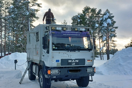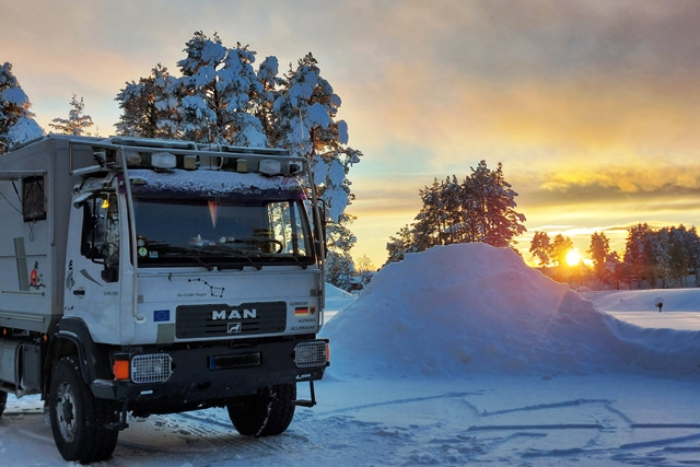 Am nächsten Tag dann morgens wieder minus 7 Grad, tagsüber gehen die Temperaturen gar in den Plusbereich. Das ist ja fast tropisch! Der MAN taut so langsam wieder auf. Abends ein schöner Sonnenuntergang.