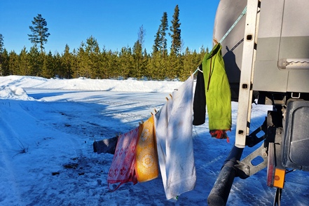 Es gibt nun mehr Möglichkeiten, auch kleinere (teilweise geräumte) Wege zu fahren, so dass wir wieder einen ruhigen Platz finden. Aber hier dann der Schreckmoment. Unsere Heckgarage steht sozusagen unter Wasser. Der Einfüllstutzen für das Frischwasser hat sich gelöst und ist abgerutscht. So ist ein Teil des Füllwassers leider nicht im Tank, sondern im Staufach gelandet. Das bedeutet mehrere Stunden Arbeit zum Trockenlegen – und das bei kühlen Temperaturen, die sich bedingt durch den ekelhaften Wind noch einmal deutlich kälter anfühlen. Ach ja, das auf der Leine sind natürlich nicht unsere Handtücher, sondern die vom Trockenlegen. Im starken Wind trocknen sie zumindest ein wenig an, der Rest erfolgt dann später im MAN auf quer gespannten Leinen.