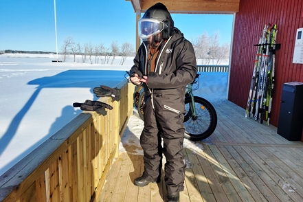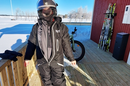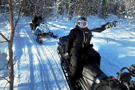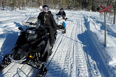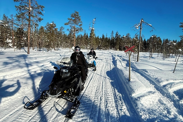 Der Montagmorgen beschert uns dann herrliches Wetter. Zwar knackig kalt mit minus 15 Grad, aber absolut klar. Heute soll nun unsere Schneemobiltour stattfinden. Wir ziehen uns warm an, werden dann an der Rezeption noch mit superwarmen Overalls und anderen Ausstattungen ausgerüstet. Die Helme sind beheizt, damit sie nicht beschlagen und man auch bei geschlossenem Visier etwas sieht. Auch die Handgriffe der Scooter sind beheizt.