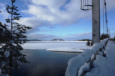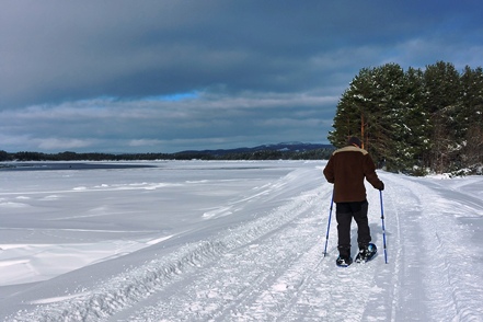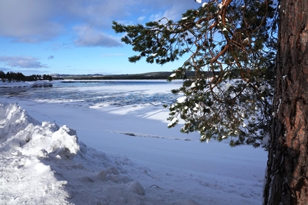 Nach einem erneuten Einkaufsgang bei besserem Wetter unternehmen wir eine erste Schneeschuhwanderung um den kleinen See am Campingplatz, wenn auch nur eine kürzere. Aber die Kräfte müssen erst langsam wieder zurückkehren.